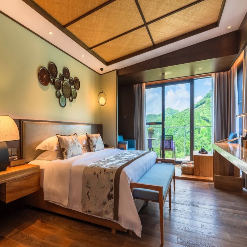 酒店坐落于湖州安吉——中国竹乡腹地,四周群山环抱、翠竹连绵,空气中负氧离子含量极高。差旅人士入住期间,可随时漫步山径、聆听溪流,或在阳台静观云卷云舒。这种天然‘氧吧’环境对缓解高压工作带来的焦虑、失眠等问题具有显著效果。将差旅目的地选于此,不仅是住宿选择,更是对身心健康的投资。