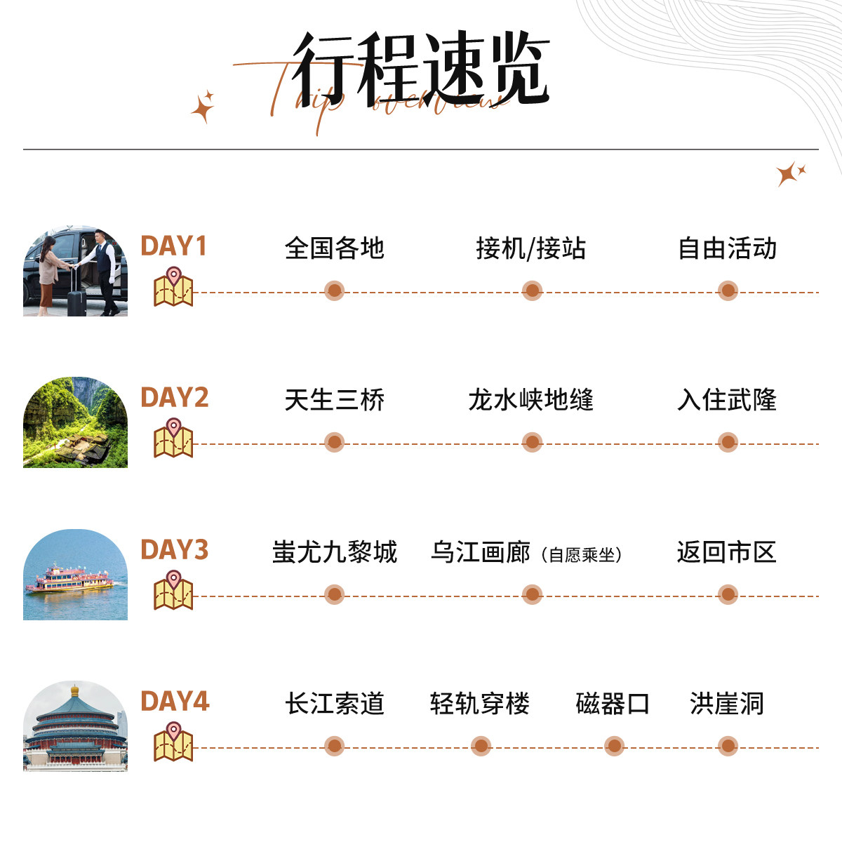 本行程支持1人单独报名参团,特别适合出差途中临时起意或独自出行的商务人士。无需等待拼团满员,随时可订、快速成行,有效利用差旅间隙享受高品质休闲时光。4天3晚紧凑行程设计,既涵盖重庆核心自然与人文景点,又避免过度消耗精力,助您在繁忙工作之余轻松切换至度假模式,实现高效差旅与深度放松的完美平衡。