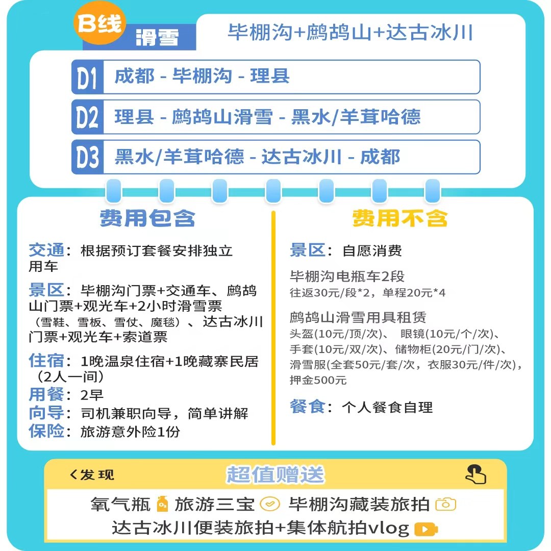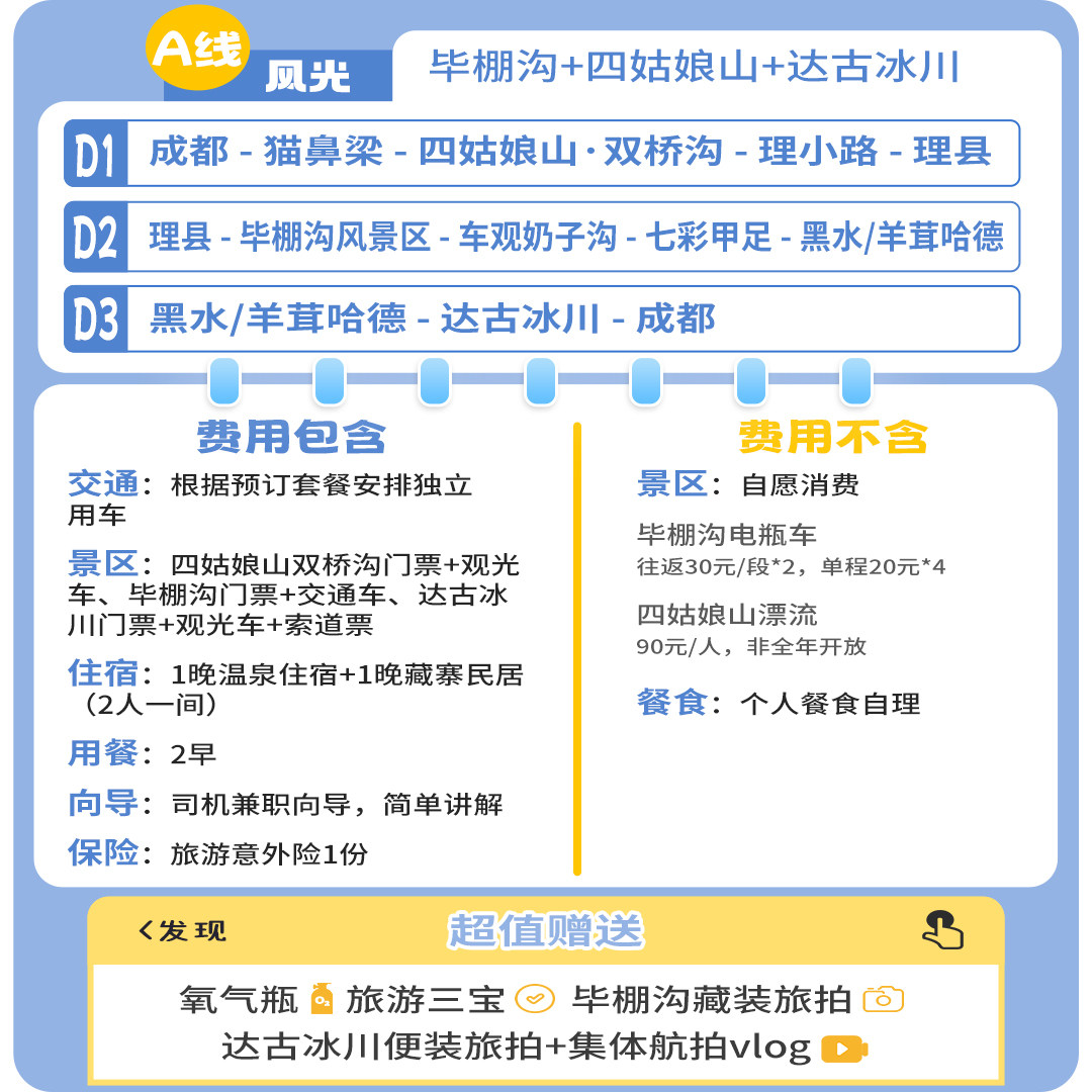 针对高原地区徒步耗能大的特点,行程科学配置滑索或索道交通,如达古冰川观光索道直达冰川腹地,毕棚沟景区内环保车接驳,大幅减少无效步行时间。差旅人士可在有限时间内高效覆盖更多景点,同时保留充沛精力享受每一处风景,实现时间与体验的双重优化。