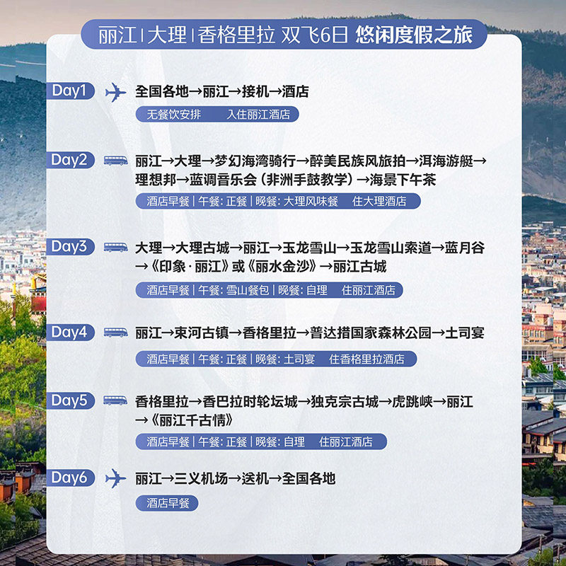 本行程专为商务差旅人士设计,覆盖广州、深圳、上海、杭州、北京等28个主要出发城市,提供直飞丽江的航班选择,大幅节省中转时间与精力。对于频繁出差的职场人而言,无需额外规划复杂交通,落地即享度假节奏。6天5晚的行程紧凑而不仓促,完美契合周末+年假组合出行需求,让差旅与休闲无缝衔接,真正实现‘说走就走’的高效旅行体验。