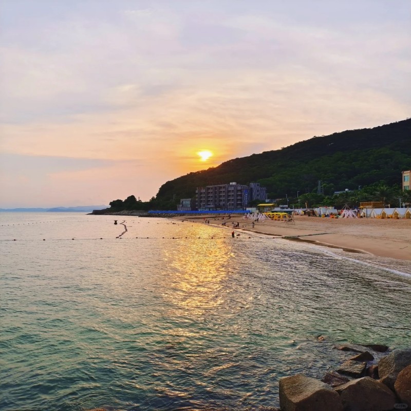 面临弯月碧水滩,滩长1300多米,水清沙洁,柔浪轻舞,银帆碧海