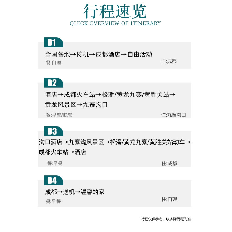 产品已包含从出发地至成都的往返机票及成都至九寨沟的动车票,彻底解决差旅人士最头疼的大交通衔接问题。无需自行比价购票、担心航班延误影响后续行程,所有交通由旅行社统一协调,确保无缝对接。您只需专注享受旅程,其余交给我们,真正实现‘拎包即走’的差旅度假体验。