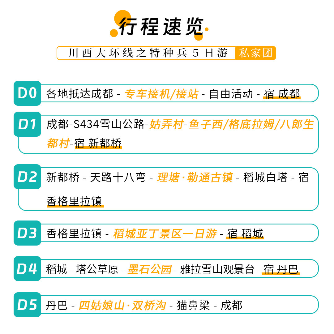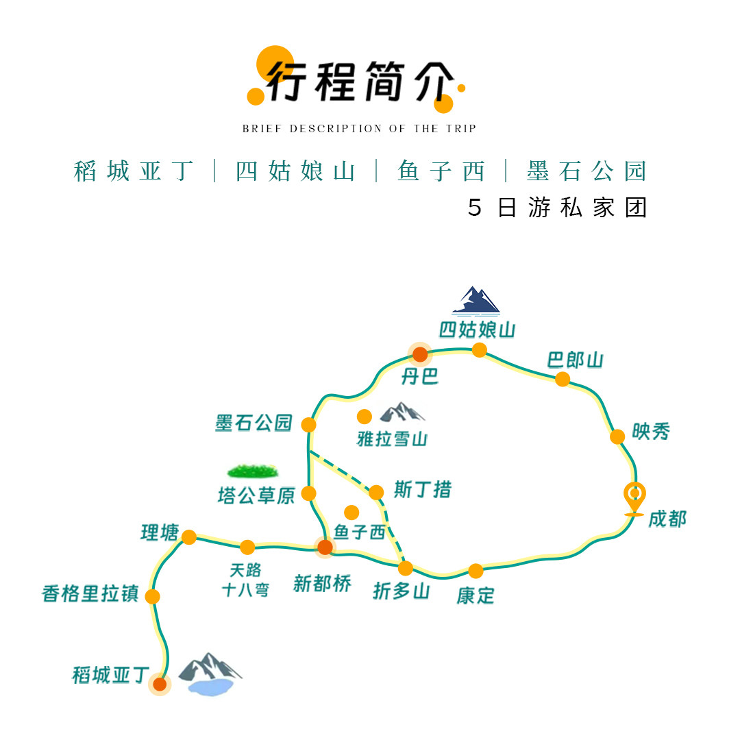 专为时间宝贵的差旅人士优化设计,5天4晚紧凑覆盖稻城亚丁、四姑娘山、鱼子西、墨石公园四大核心IP,避免冗长交通耗时。路线经反复打磨,每日车程合理分配,确保白天充分游览、夜晚舒适休整。周五下班出发、周二返程即可完成全程,完美契合周末+年假组合模式,让有限假期释放最大旅行价值,告别走马观花式打卡。
