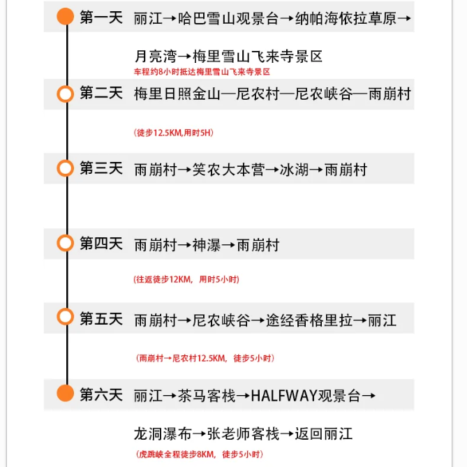 精心压缩至6天的行程长度,完美契合多数企业5-7天的年假制度,无需额外请假即可完成一场深度度假。前两日适应海拔并游览丽江,中间三日集中徒步核心景点,最后一日返程缓冲,节奏张弛有度。这种‘模块化’设计让差旅人士轻松规划,告别长假难批的困扰,实现工作与生活的高效平衡。