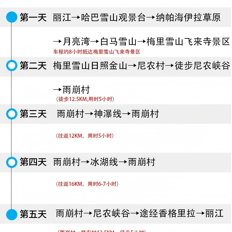 专为时间紧张的差旅人群定制5日纯玩行程,无购物、无隐形消费,全程聚焦核心体验。从丽江出发,途经香格里拉、纳帕海,深入梅里雪山腹地雨崩村,节奏张弛有度。即使只有周末加三天年假,也能完成一次高海拔徒步与自然疗愈之旅,让短暂假期释放最大价值。