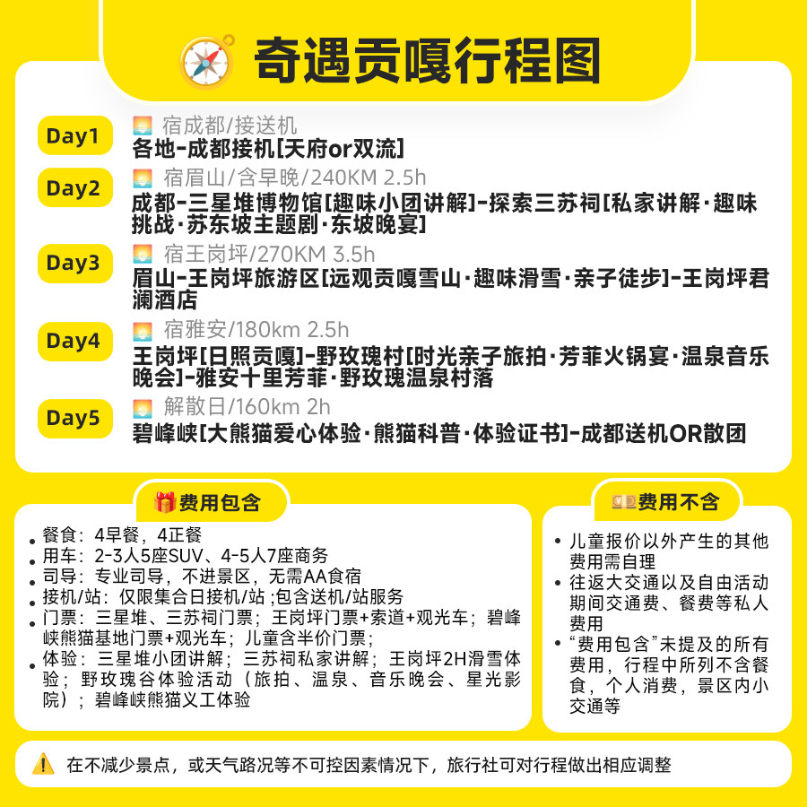 本行程专为差旅人士设计,从成都便捷出发,5天4晚高效覆盖德阳三星堆、雅安碧峰峡及王岗坪贡嘎雪山等精华景点。行程节奏张弛有度,既满足商务出行后的身心放松需求,又兼顾文化探索与自然奇观体验。全程私家小团,减少等待时间,提升差旅效率,是商务与休闲完美融合的理想选择。