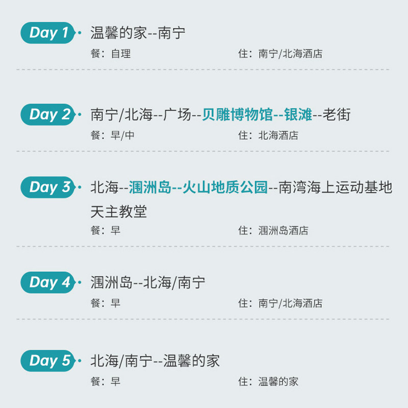 6日行程科学规划南宁、北海、涠洲岛三地联动,最大化利用周末+年假组合的碎片化时间。从城市文化到海岛生态,内容丰富却不赶路,特别适合请3休8的差旅族。每日车程合理控制,住宿优选近景区酒店,减少通勤损耗,确保每一分钟假期都物有所值。