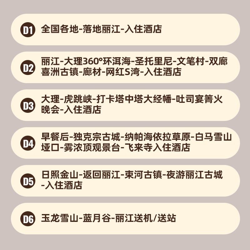 专为时间宝贵的职场人打造6日纯玩行程,节奏张弛有度,既涵盖丽江古城、香格里拉松赞林寺、梅里雪山日照金山等核心体验,又避免过度奔波。适合利用年假或长周末组合出行,最大化利用有限假期,在紧凑日程中收获文化、自然与美食的多重满足,实现高效度假。