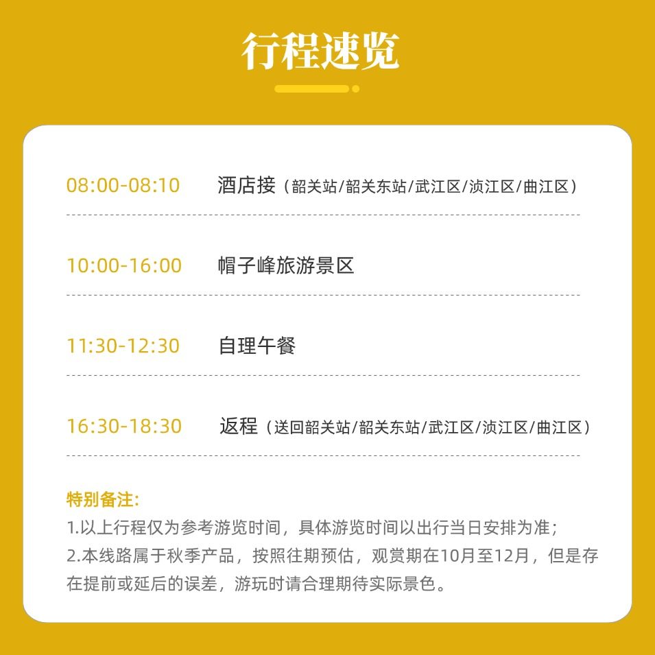 产品从韶关本地出发并返回,特别适合已在韶关出差或参加会议的旅客。无需额外安排跨城交通,节省大量中转时间与成本。一日游设计紧凑合理,早上出发、傍晚返回,不影响次日工作安排,是差旅间隙放松身心的理想选择。