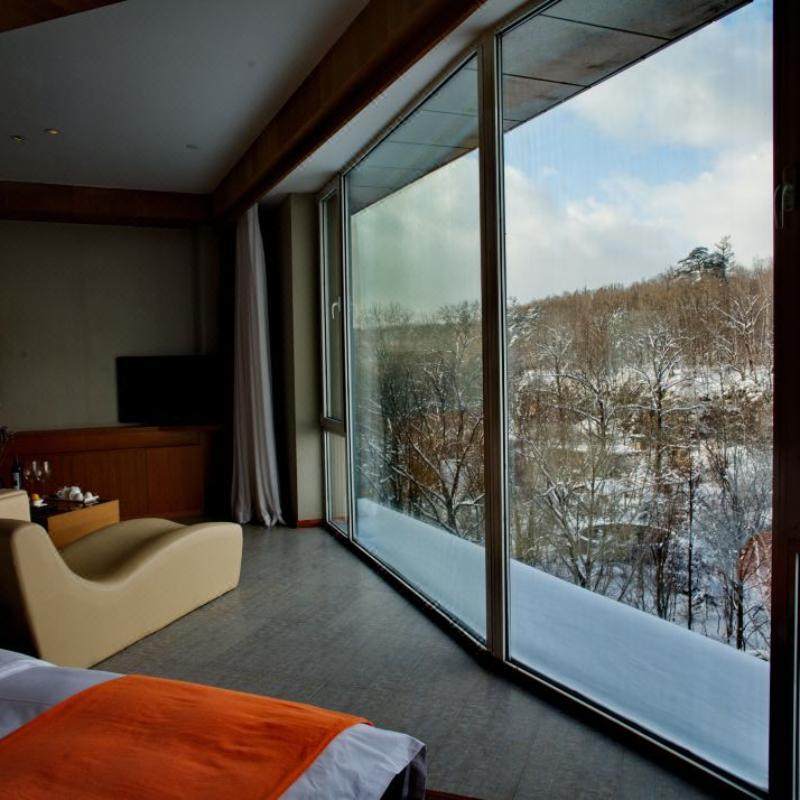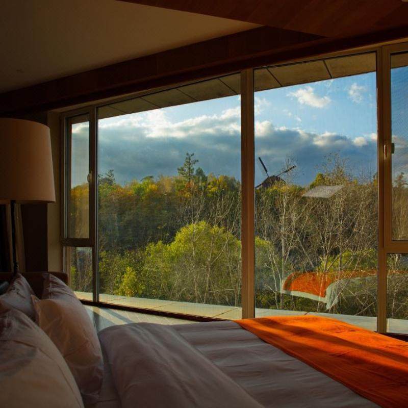 酒店处于长白山脚下,露天汤泉面朝山野,隐与森林,边泡汤边欣赏雪山