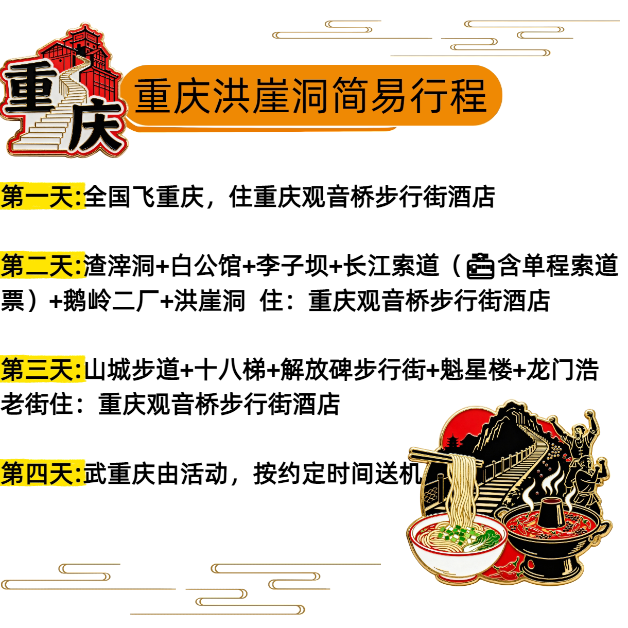 精心设计的4天3晚行程,完美适配周末+年假组合或短途差旅间隙。首日抵达即入住观音桥核心酒店,次日集中游览李子坝、索道、洪崖洞等精华景点,第三日自由探索或商务活动,第四日从容返程。节奏张弛有度,既保证核心体验全覆盖,又预留弹性时间应对临时工作安排,真正实现差旅与休闲的无缝衔接。