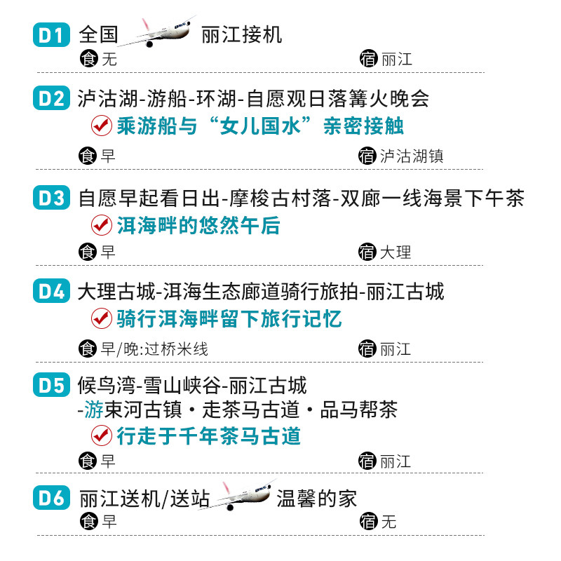 行程涵盖丽江古城、洱海S湾、泸沽湖等多个网红旅拍胜地,光线、构图与背景俱佳,特别适合热爱记录生活的差旅人群。无论您是用手机还是专业相机,都能轻松捕捉雪山、湖泊、古镇与花海交织的绝美画面,为繁忙工作之余留下值得珍藏的视觉记忆。