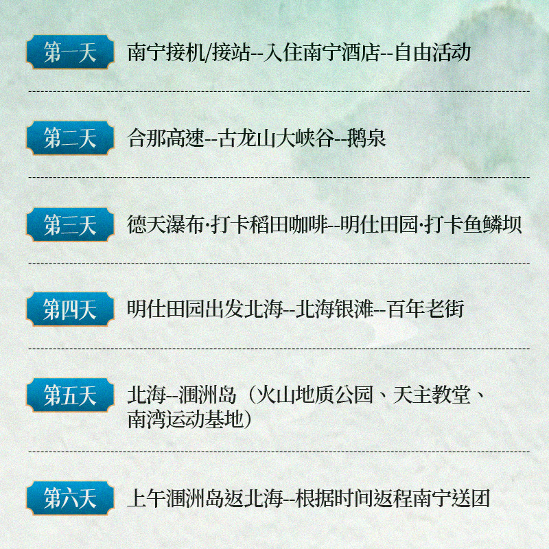 6天5晚的行程长度经过精心测算,既保证深度体验德天瀑布、涠洲岛两大核心目的地,又避免过长假期影响工作安排。行程节奏张弛有度,每日车程合理控制,确保您既能打卡世界级景观,又不会因舟车劳顿而影响返岗状态,完美适配年假、调休或长周末的差旅延伸需求。