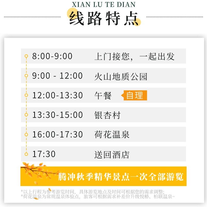 行程精心规划,将腾冲秋季最具代表性的火山地质公园、银杏村与荷花温泉浓缩于一日之内,节省差旅时间成本。无需多日请假或调整工作安排,利用周末或单日空档即可完成深度体验,兼顾效率与休闲,满足商务人士对时间管理的高要求。