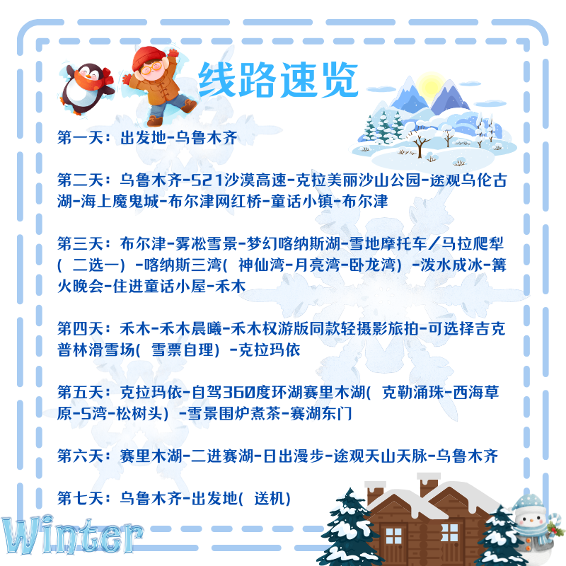 线路以乌鲁木齐为起点,无缝衔接阿勒泰喀纳斯湖、赛里木湖及博尔塔拉等目的地,优化交通动线,减少无效耗时。特别适合从乌鲁木齐出差结束后的延伸度假,7天6晚的行程节奏张弛有度,既满足商务差旅的时间约束,又充分展现北疆冬季雪域风光,实现工作与休闲的高效切换。