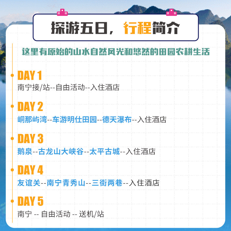 本线路专为差旅人士设计,从南宁便捷出发,可自由选择前往崇左或百色方向,兼顾商务与休闲需求。5天4晚的行程节奏张弛有度,既适合完成区域业务拜访后顺道度假,也便于安排短途调休。全程纯玩小团,无购物干扰,确保差旅效率与旅行品质兼得,是广西区内高效差旅+轻度假的理想之选。