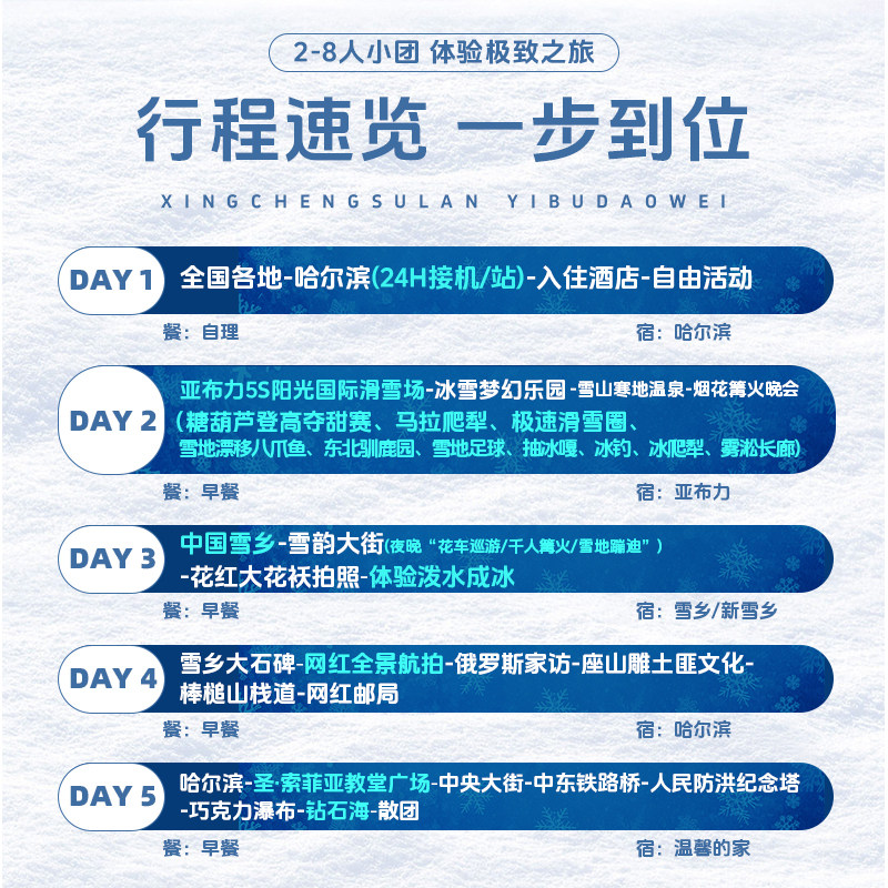 本行程支持单人预订,无需拼团等待,特别适合商务出差后顺道度假或独自出行的旅客。无论您是临时起意还是计划已久,都能快速成行,省去协调多人时间的烦恼。结合哈尔滨及牡丹江的精华景点,5天4晚的紧凑安排既满足深度体验,又不耽误后续工作安排,真正实现差旅与休闲的无缝衔接。