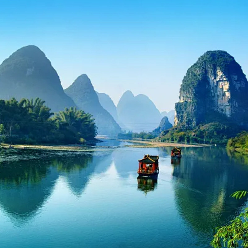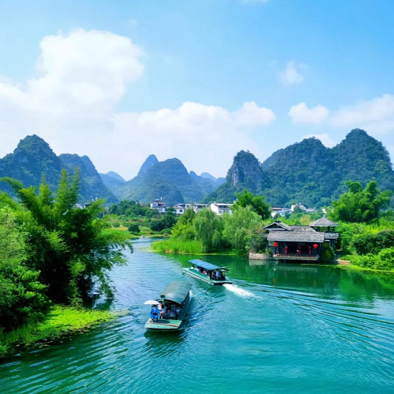 行程包含大漓江三星标准游船,舒适座椅、观景甲板一应俱全,适合差旅人士在舟行碧波中缓解工作压力。乘船穿越九马画山、黄布倒影等经典段落,无需体力消耗即可沉浸式感受“人在画中游”的诗意,是高效放松的理想选择。