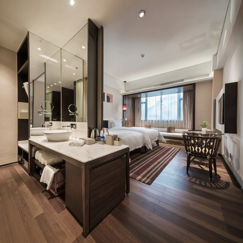 酒店提供LOFT结构的文艺清新风客房,挑高空间与自然采光营造开阔视野,既适合视频会议,也便于资料整理与临时办公。设计融合茶文化元素与现代简约风格,让差旅住宿不仅是落脚点,更是激发灵感与审美的休憩空间。