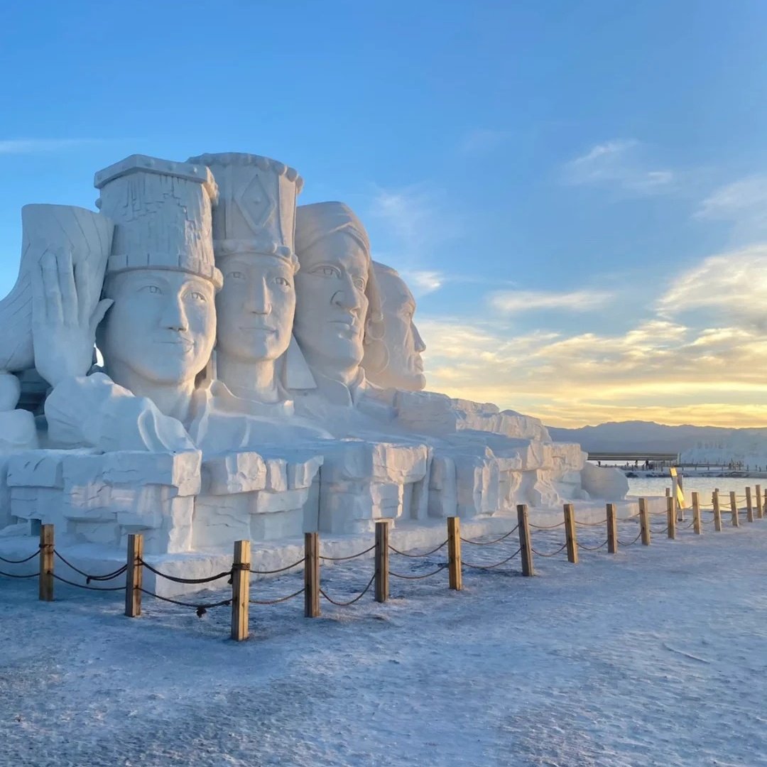 湖畔矗立座座巨型盐雕,造型各异,展现独特的艺术魅力。