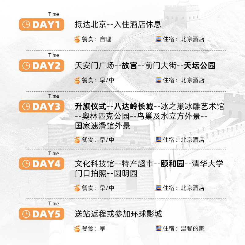 武汉、长沙、郑州等中部城市拥有直飞北京的高频航班,为差旅人士提供高效出行方案。本行程巧妙融合商务与文旅需求,5天内覆盖故宫、长城、天坛三大世界遗产,并特别安排冬季冰雕主题体验及升旗仪式观礼。单人即可预订的设计,解决了独自出差者难以组队游玩的痛点,让短暂驻留也能深度感知北京的历史厚度与现代活力。