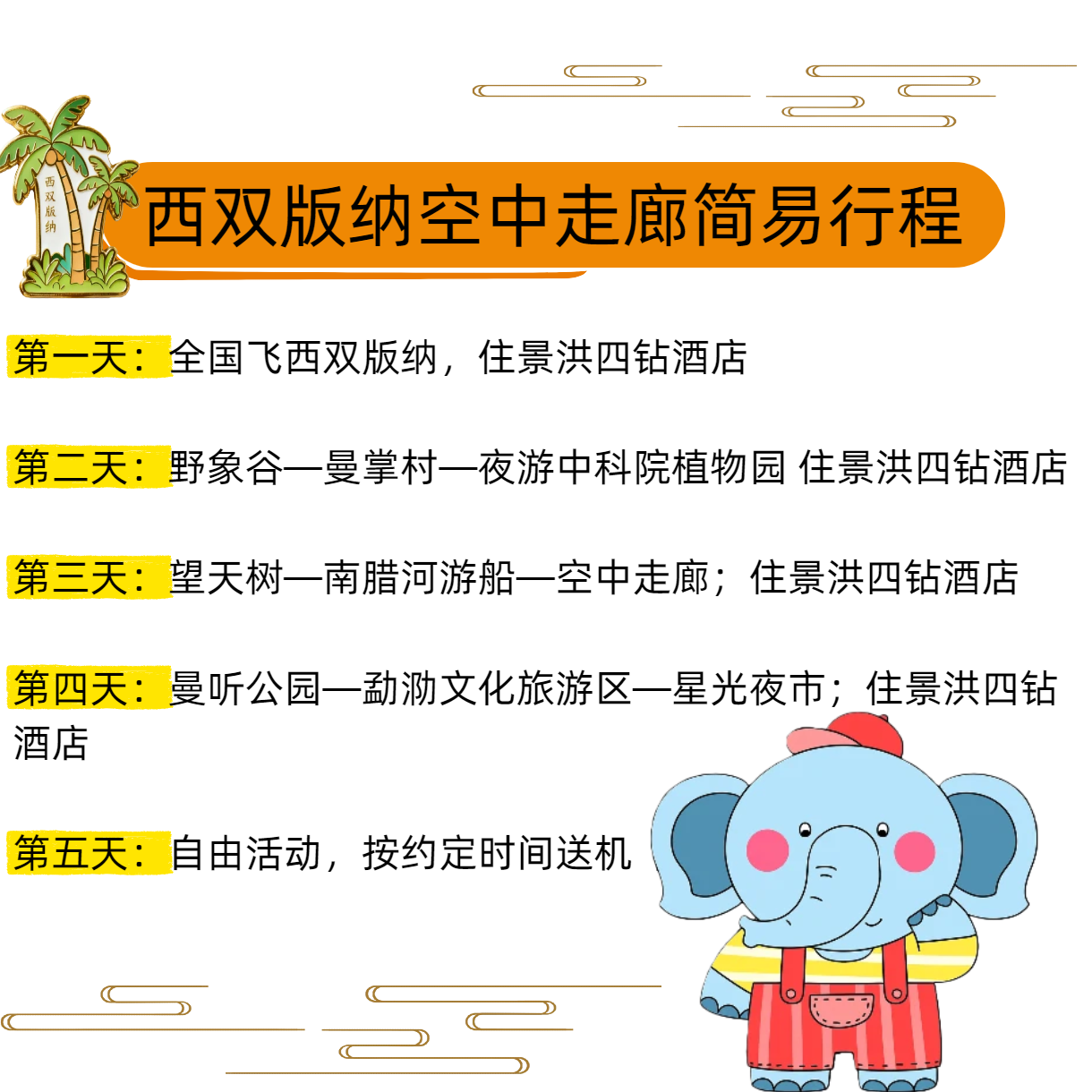 精心规划野象谷、曼掌村、曼听公园、望天树、南腊河游船及空中走廊等西双版纳最具代表性的景点,兼顾自然生态、民族文化与互动体验。差旅时间宝贵,我们确保您在有限假期中高效打卡精华内容,不错过任何一处值得铭记的风景与文化印记。