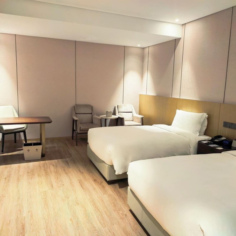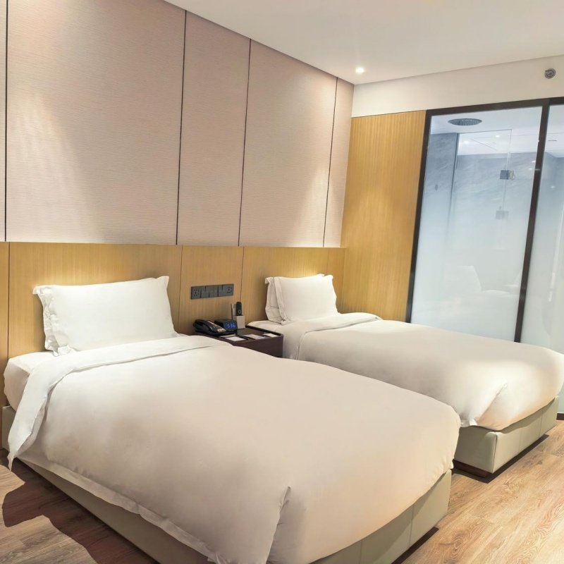 房间空间宽敞、采光良好,整体氛围温馨舒适,配备齐全的现代化设施,包括高品质床品、智能温控系统及充足储物空间。特别值得一提的是淋浴水压强劲、温度调节灵敏,确保您在忙碌差旅后享受洁净舒缓的沐浴体验,恢复最佳状态。