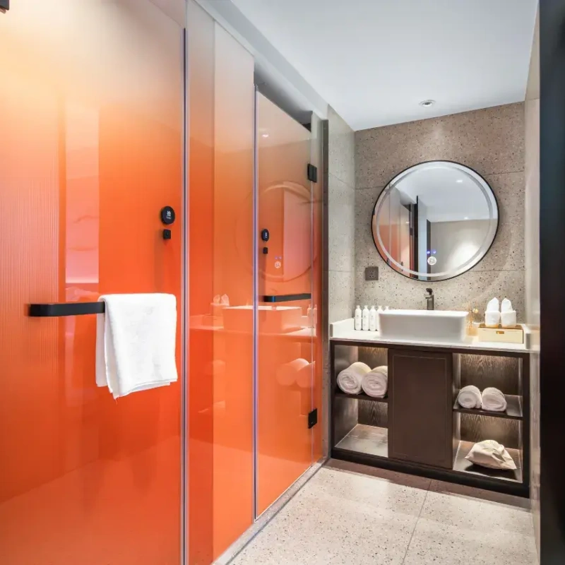 卫生间采用高品质玻璃隔断,通透且防溅;洗手台旁配备明亮镜面,不仅方便晨间整装或夜间洁面,更在视觉上拓展空间感。干湿分离设计与充足照明,让洗漱过程高效又舒适,即便是短暂停留,也能享受如家般的洁净体验,为高强度差旅注入一丝精致感。