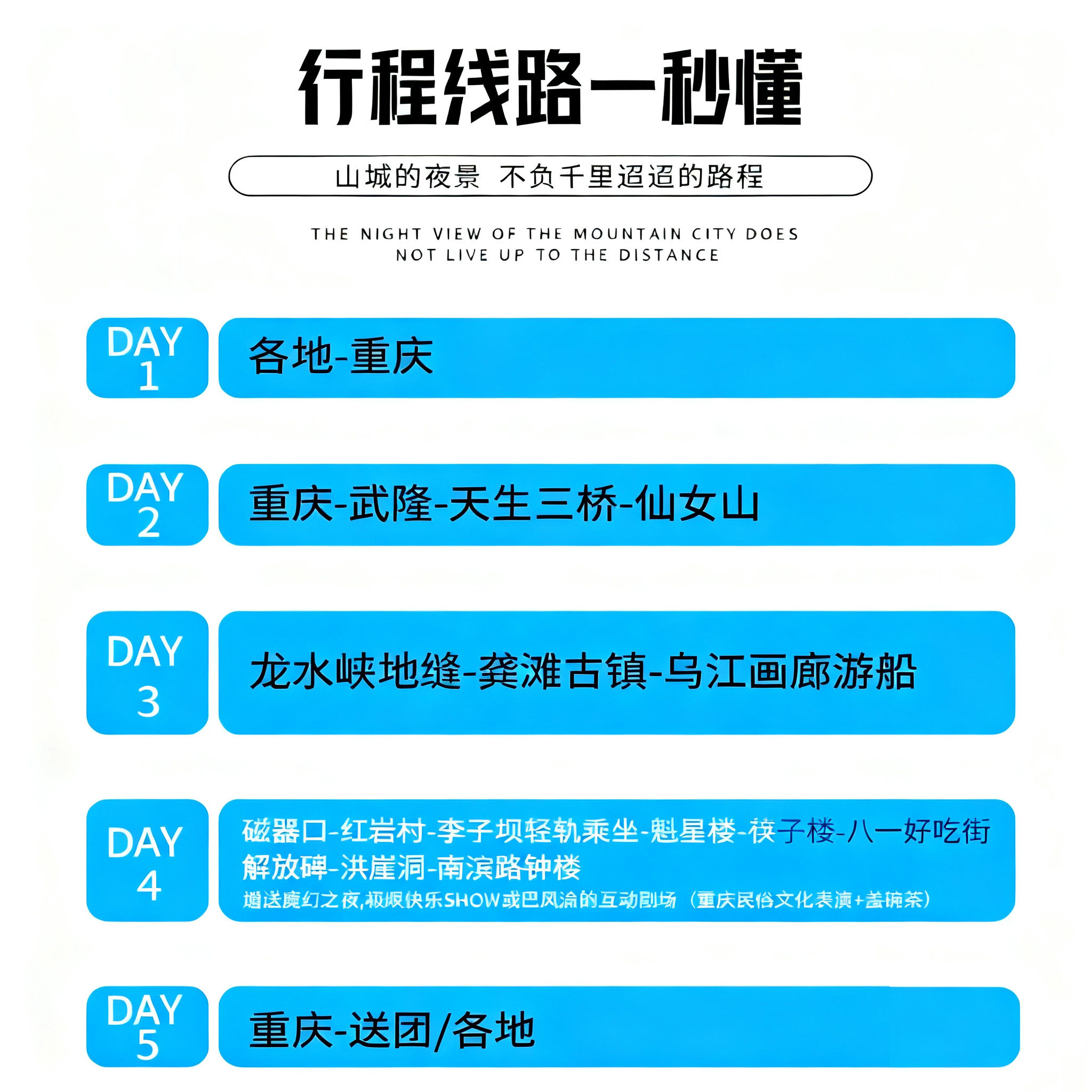 5天4晚的行程设计精准契合周末+年假组合或短期差旅窗口,无需请长假即可深度游览重庆精华景点。紧凑而不仓促的日程安排,确保差旅人士在有限时间内最大化体验价值,返程后迅速回归工作状态,无后顾之忧。