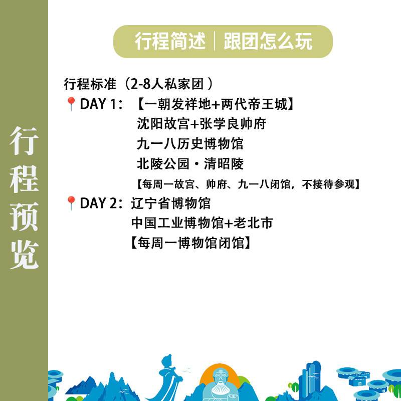 无需携带繁重装备,本产品聚焦沈阳市区及近郊核心景点,以都市观光为主题,轻松步行+短途车程即可完成全部行程。所有门票、交通、讲解均已包含,您只需带上证件和好心情。特别适合出差途中临时起意的短途放松,省去攻略研究与琐碎安排,即刻开启一场说走就走的文化微度假。