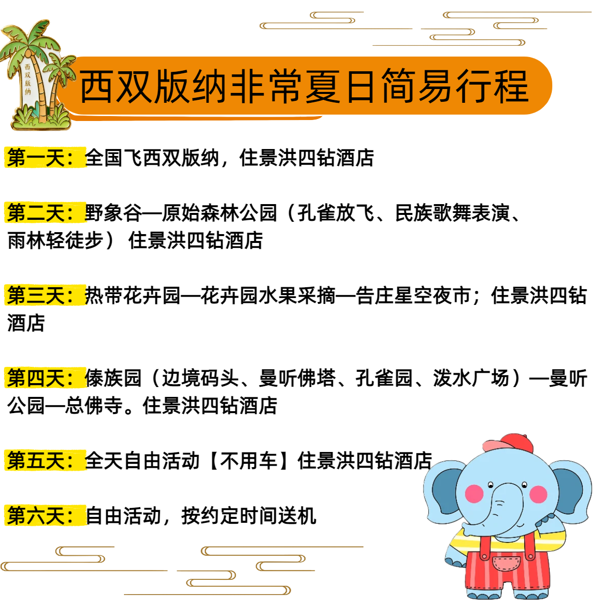 行程精心涵盖西双版纳最具代表性的五大景点:野象谷探秘亚洲象、原始森林公园徒步雨林、星空夜市品味烟火气、傣族园体验泼水狂欢、曼听公园感受傣王御花园的静谧。这些景点不仅展现热带风情与民族文化,更避免冗余路线,确保差旅人士在有限时间内深度体验目的地精髓,无需自行规划复杂动线。