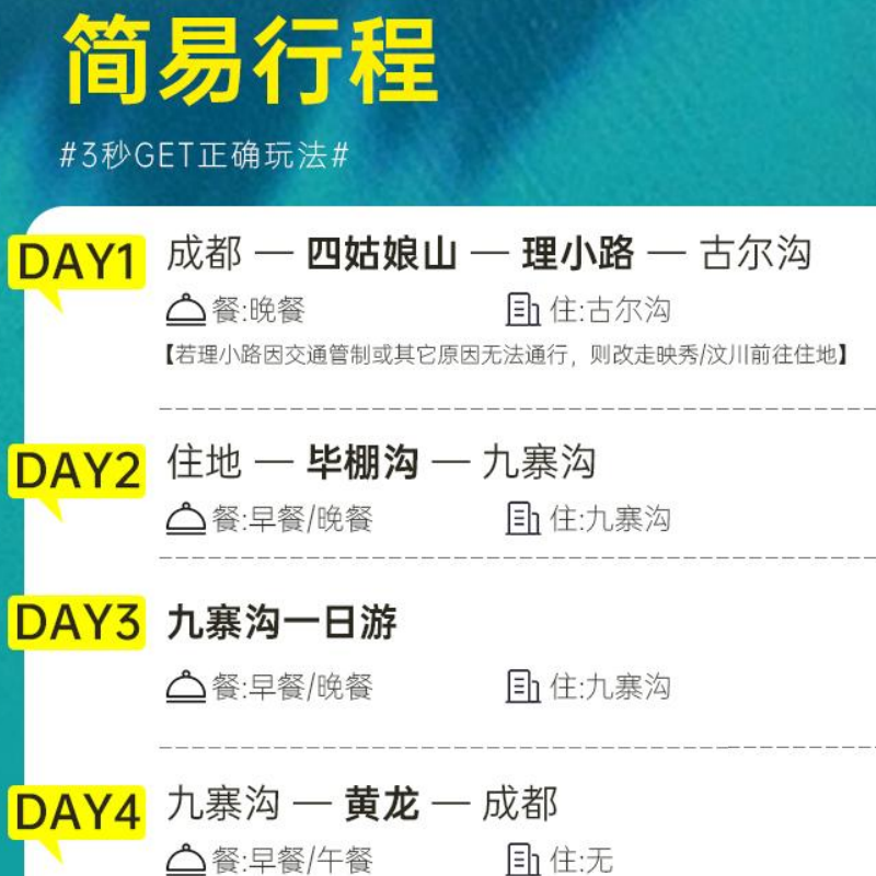 专为时间紧张的差旅人群设计,四天内高效串联九寨沟(世界自然遗产)、黄龙(钙华奇观)、毕棚沟(川西小瑞士)与四姑娘山(东方阿尔卑斯)四大顶级IP。科学规划路线,减少重复折返,每日车程合理分配,确保您在短暂假期中收获最密集的视觉震撼与自然疗愈,实现‘短假长忆’的差旅度假目标。
