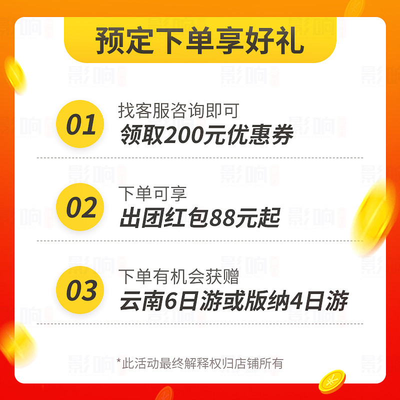 从西双版纳当地接送、特色餐饮安排到精品酒店住宿及景点门票,所有环节均由专业团队统一协调。差旅人士无需耗费精力比价、订车、排队,真正实现“拎包即享”。尤其适合结束紧张工作后希望彻底放松的您——只需专注于体验热带雨林的神秘、傣家文化的魅力,其余琐事交给我们,让宝贵的假期时间100%用于愉悦与充电。
