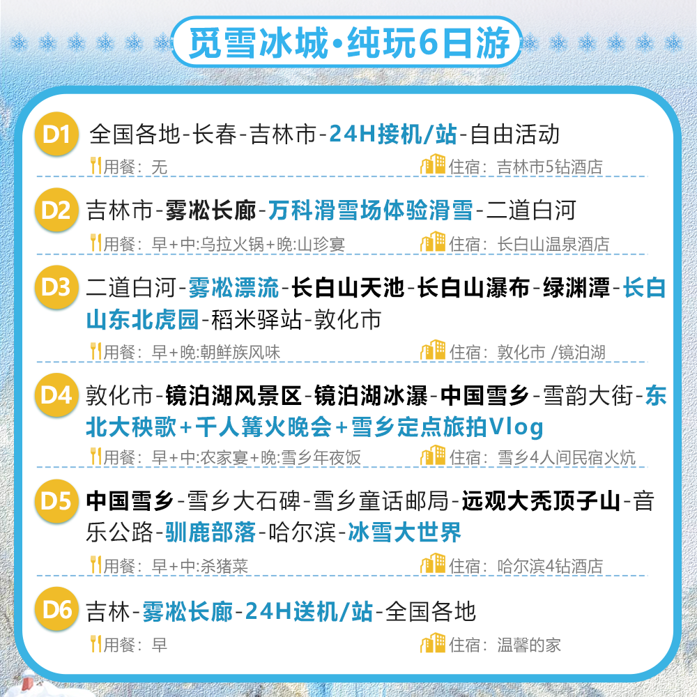 本线路支持从长春、北京、上海、广州、深圳等全国30余个主要城市出发,提供便捷直飞或高铁接驳至哈尔滨的交通方案,极大节省差旅人士中转时间。无论您是从华北、华东还是华南出发,均可灵活安排出行日程,无缝衔接6天5晚的冰雪度假行程,兼顾商务效率与休闲体验,让差旅不再疲惫,而是开启一段北国奇遇。