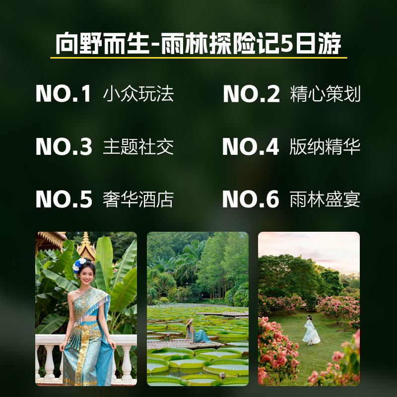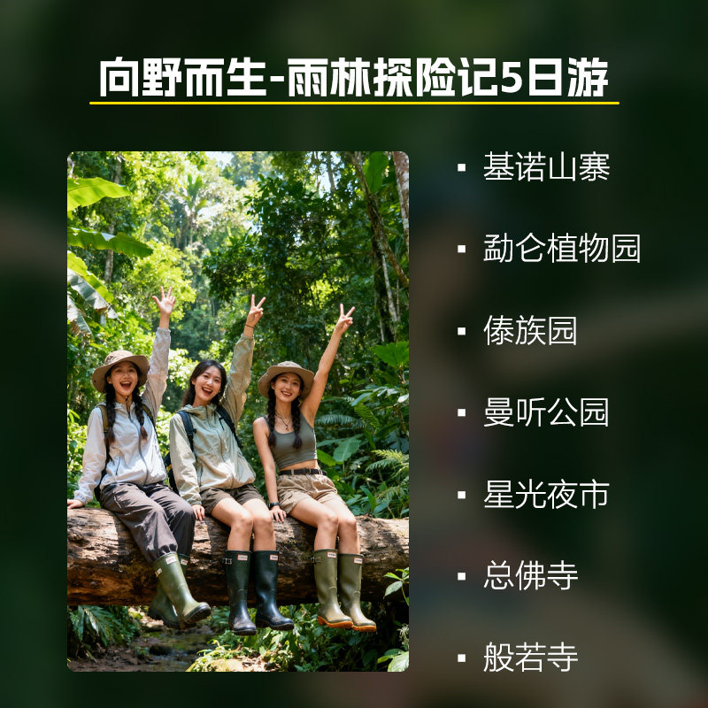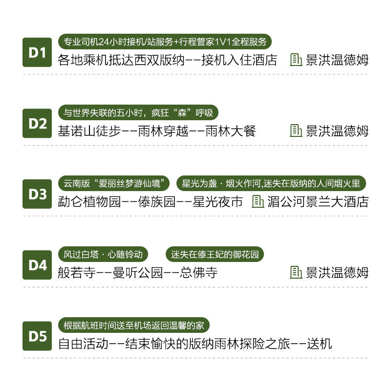 针对时间宝贵的差旅人群,本行程科学规划5天4晚节奏,首日抵达即开启轻松游览,末日预留充足返程时间。涵盖中科院勐仑植物园——中国最大热带植物宝库,以及星光夜市这一网红打卡地,白天探索自然奇观,夜晚品味地道美食与手作文化,高效利用每一分钟,让短假不将就。