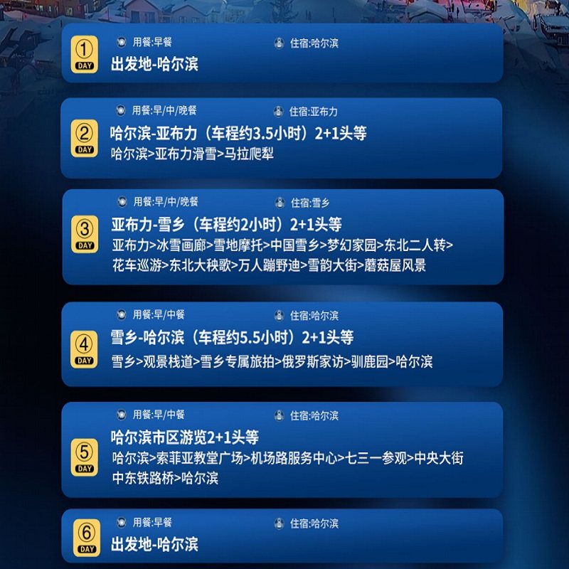 采用“2+1”航空座椅大巴作为全程交通工具,座位宽敞、配备USB充电口与靠枕,极大提升长途乘坐舒适度。从哈尔滨市区到亚布力滑雪场等目的地,交通衔接紧密,减少无效等待时间。对于时间宝贵的差旅人士而言,这种高效、省心的交通安排能有效平衡工作与休闲,确保在有限假期中获得最大化的度假体验。