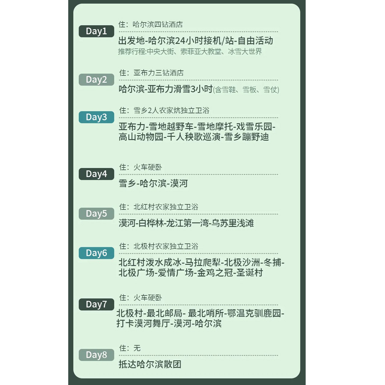 本线路专为兼顾差旅与休闲的旅客设计,从哈尔滨高效出发,无缝衔接雪乡、亚布力、漠河及北极村等核心冰雪目的地。行程安排紧凑合理,既满足商务人士对时间效率的需求,又充分融入东北冬季特色体验,如滑雪、温泉、驯鹿互动等,让差旅之余尽享北国风光,实现工作与度假的完美平衡。