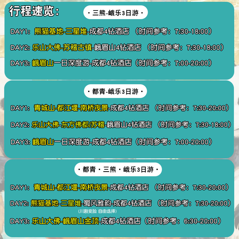 本产品打破传统观光模式,以“人文+自然”双主线贯穿全程:上午探秘三星堆青铜文明,下午仰望乐山大佛千年慈悲;晨起徒步峨眉清音阁,傍晚漫步都江堰古街。这种结构化行程既满足差旅人士对文化深度的需求,又提供自然疗愈空间,实现精神与身体的双重充电。