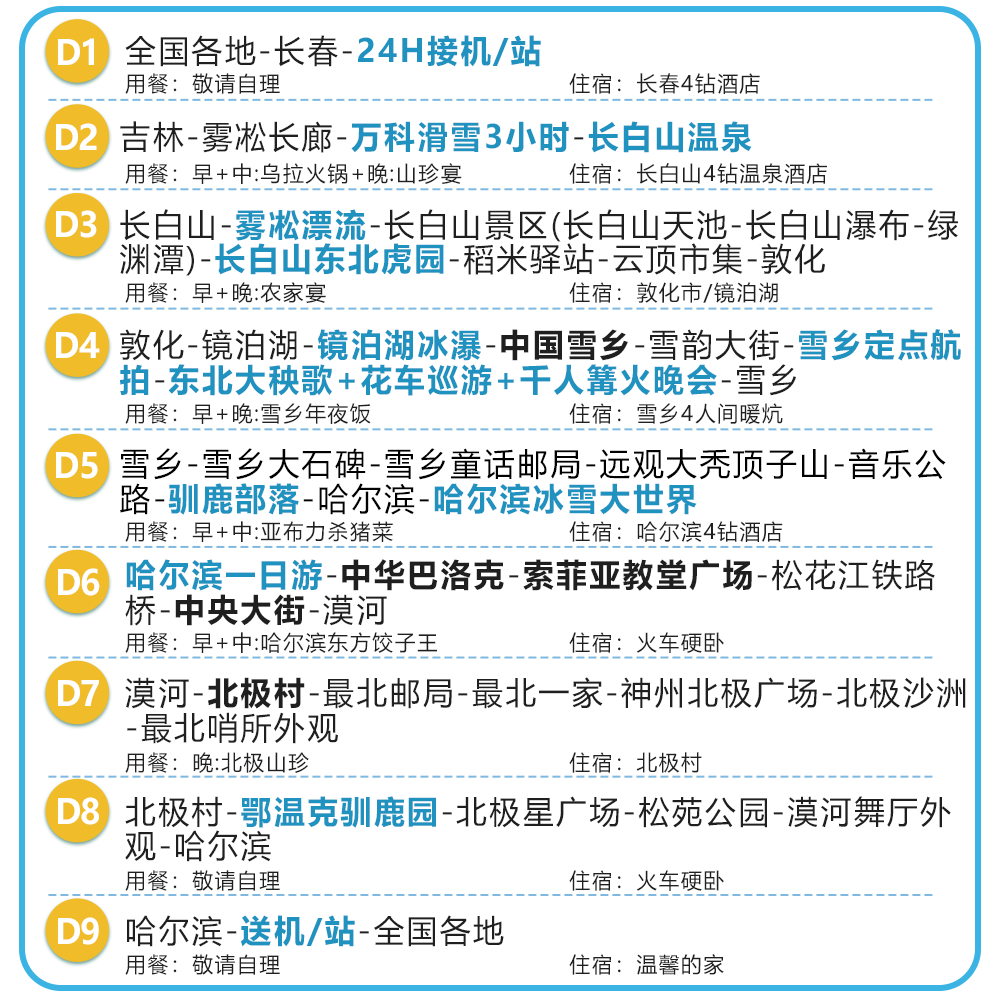 • 差旅高效动线:9天8晚覆盖四大冰雪胜地,行程紧凑不冗余