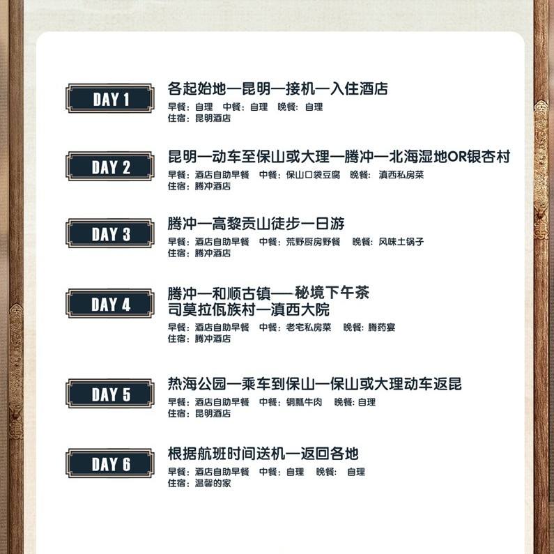 6天5晚行程巧妙串联昆明、保山、腾冲三大目的地,从春城花都到边陲温泉秘境,一次出行即可领略高原湖泊、火山地热、侨乡文化与少数民族风情。对于希望在有限差旅假期中获取最大体验值的旅客,这种多维组合极大提升了行程的丰富度与记忆点。
