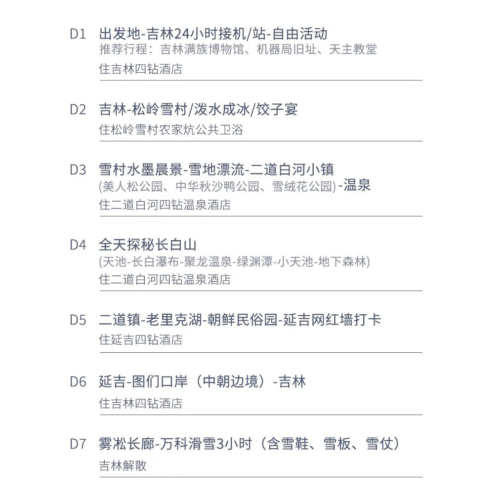 本行程专为从吉林市出发的差旅及度假人群设计,无缝衔接延边、长白山、二道白河等核心旅游节点,节省中转时间与交通成本。全程7日纯玩路线覆盖松岭雪村、延吉、图们等多元目的地,既适合商务人士利用周末或小长假放松身心,也便于家庭或小团体高效完成一次深度冰雪之旅。交通安排灵活,支持24小时接机/接站服务,极大提升差旅出行便利性。