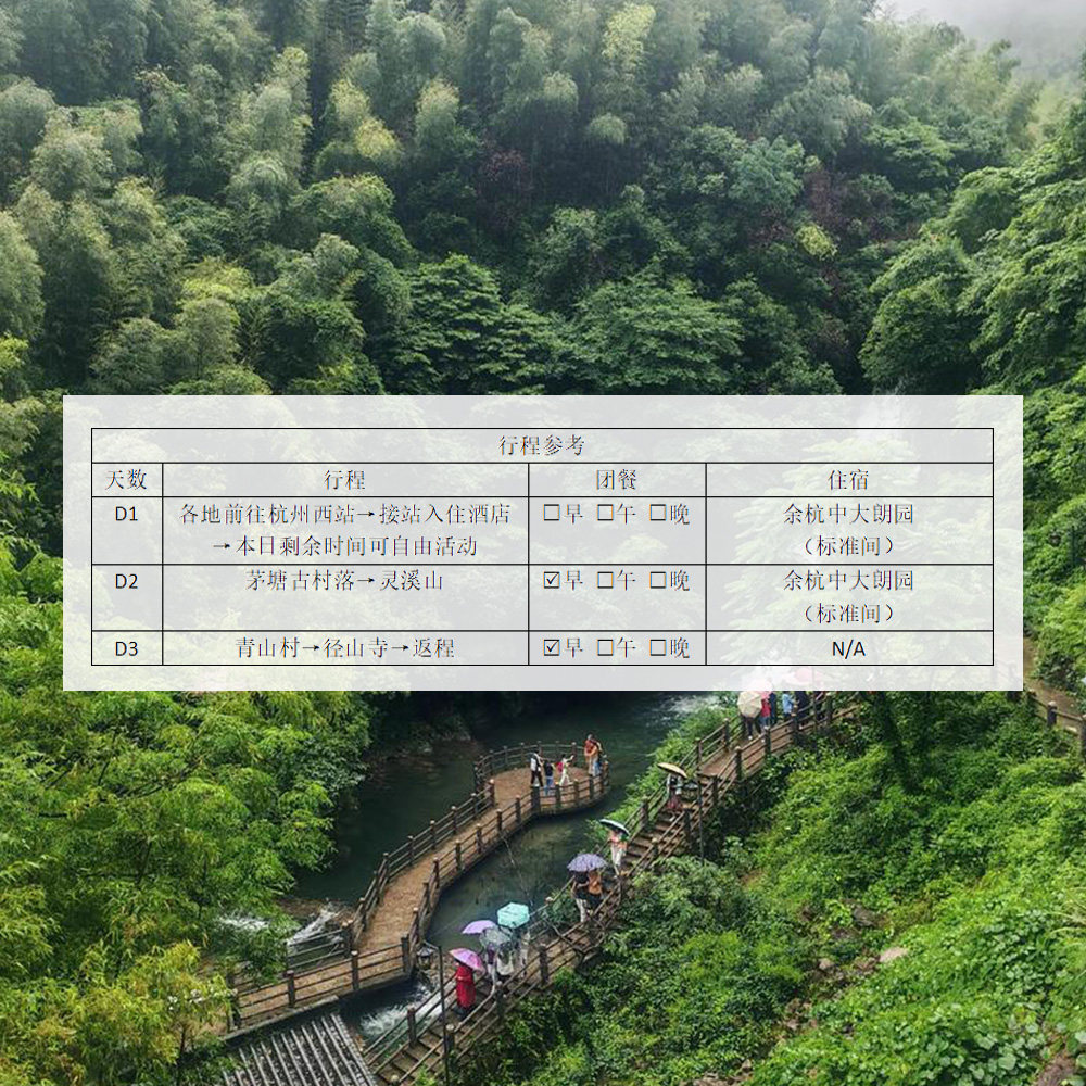 行程覆盖杭州与湖州两地,从杭州主城区出发仅需1-2小时车程即可抵达灵溪山及周边古村落,非常适合利用周末或会议间隙开展短途度假。差旅人士可将此线路作为延伸行程,在完成公务后无缝切换至休闲模式。交通接驳便利,支持定点接站,节省中转时间,真正实现‘工作+度假’的一站式高效安排。