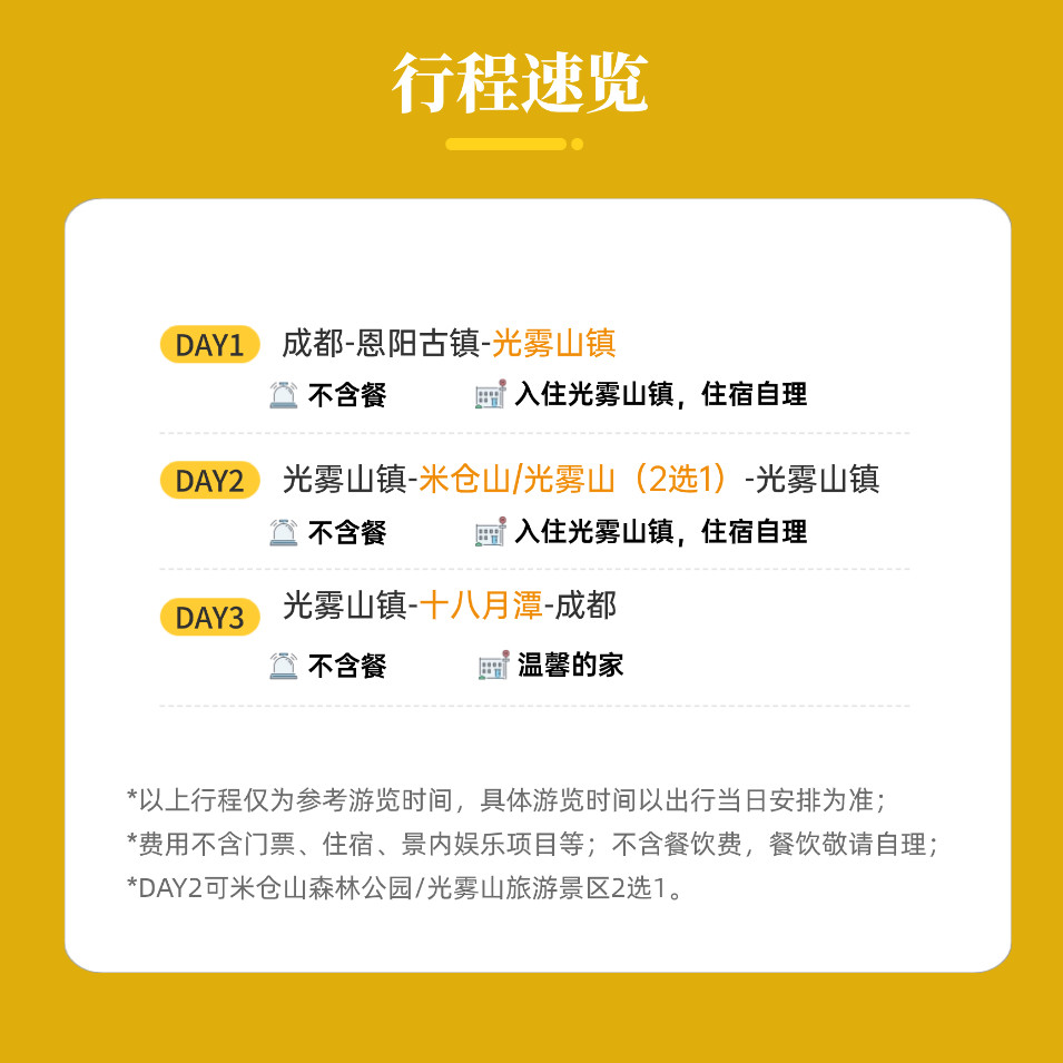 本线路支持1人即可预订,特别适合商务人士在差旅间隙安排短途度假。从成都出发前往巴中光雾山,全程包车服务,省去公共交通转乘烦恼。更可依据个人时间与兴趣定制3日行程节奏,无论是紧凑高效还是悠闲放松,都能灵活适配差旅安排,真正实现工作与休闲的无缝衔接。