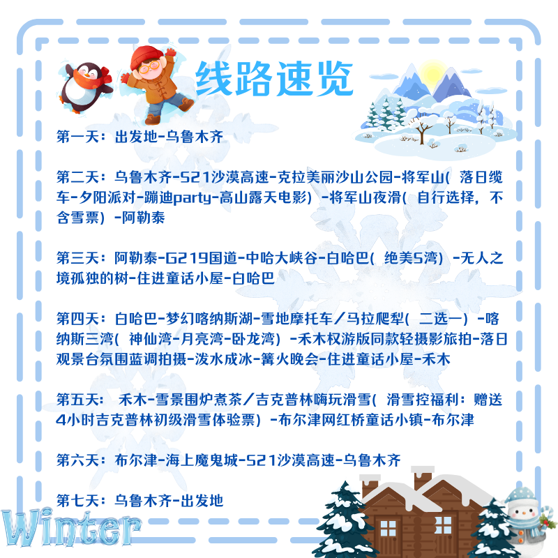 本线路支持单人预订,无需拼团等待,特别适合商务出差间隙或独自出行的旅客。无论您是从乌鲁木齐出发还是结束差旅后想就近度假,7天6晚的行程安排紧凑而不仓促,既能高效完成工作,又能沉浸式体验北疆冬季风光,真正实现工作与休闲的无缝衔接。