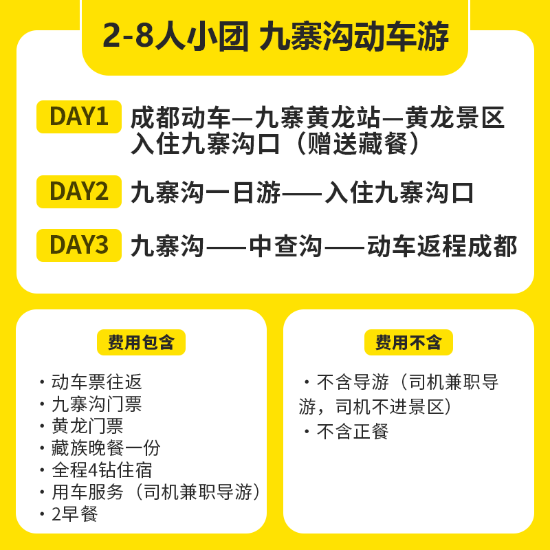 精心设计的3天2晚行程,从成都出发当天抵达、次日全天游览、第三天返程,时间安排紧凑合理,非常适合利用周五至周日或调休两天完成一次高质量度假。差旅人士可在不耽误主要工作的前提下,快速切换至放松模式,沉浸于九寨沟的碧水彩林与黄龙的钙华奇观之中,高效充电再返职场。