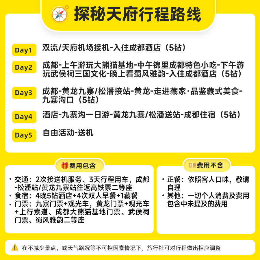 本行程专为差旅及家庭出游设计,支持2人即可成团,无需拼团等待,极大提升出行灵活性。从成都出发,涵盖熊猫基地、武侯祠、九寨沟、黄龙等核心景点,行程紧凑高效,适合工作之余安排短途亲子度假。私家小团模式确保服务专属、节奏可控,兼顾商务差旅的效率与家庭旅行的温馨体验。