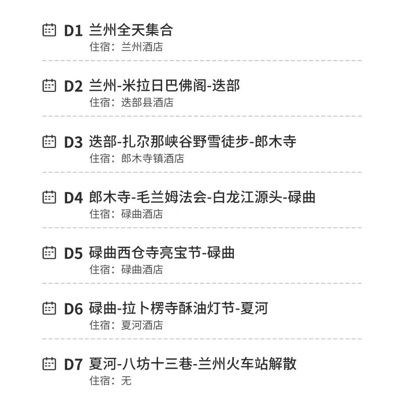 行程以兰州为起止点,极大便利从全国各地飞抵兰州的商务旅客。无需中转或额外安排交通,落地即开启旅程,返程亦可直接衔接航班。7日纯玩设计紧凑而不仓促,覆盖甘南核心景点如米拉日巴佛阁、郎木寺、扎尕那等,兼顾文化体验与自然风光,让差旅人士在有限时间内获得高密度的旅行价值,实现工作与休闲的完美平衡。