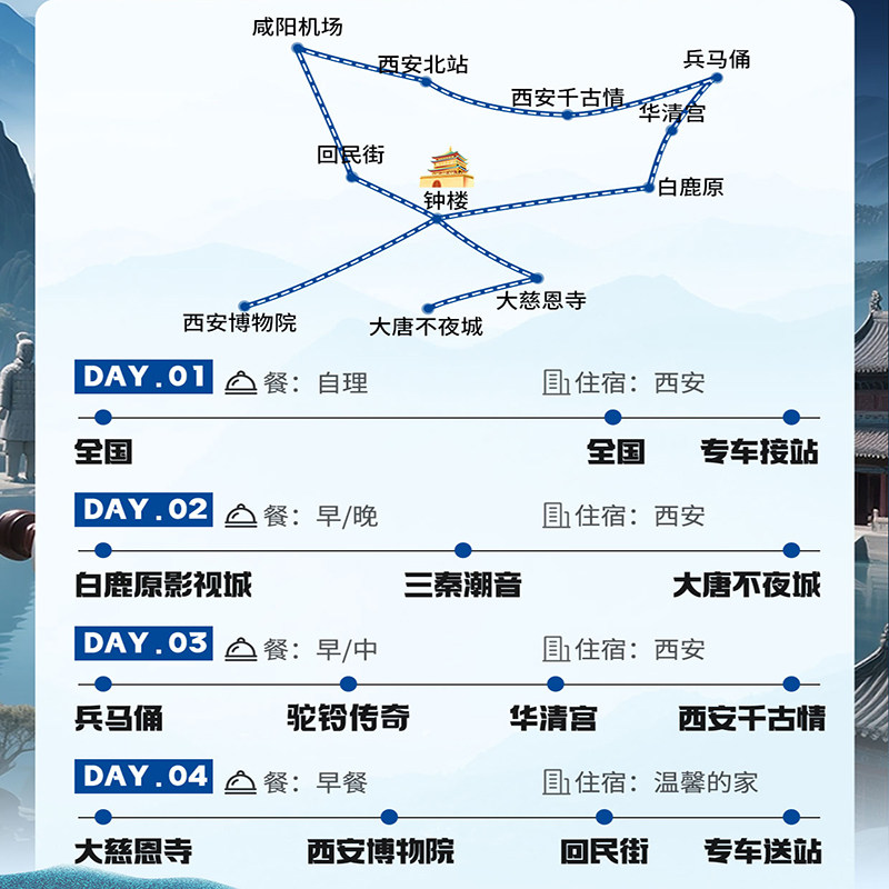 本产品定位“人文旅行”与“主题游”,专为希望在短暂停留中深度理解西安历史的差旅者设计。从秦始皇陵的恢弘到白鹿原的文学意象,再到大唐不夜城的盛世复现,行程以故事线串联景点,帮助您在4天内构建对古都的立体认知。无需做功课,专业讲解即刻带您进入历史现场,提升差旅的文化附加值。