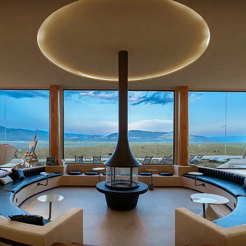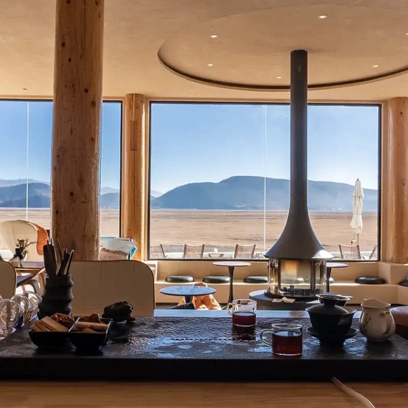 庄园融合法式建筑美学与藏地自然元素,三层现代设计搭配大面积落地窗,将草原、湖泊、雪山引入室内视野。对从事创意、设计或战略工作的差旅人士而言,这样的环境极具启发性——清晨在湖光山色中开启头脑风暴,午后于露台咖啡间沉淀思考。空间本身即成为灵感催化剂,助力差旅期间保持高效与创造力。