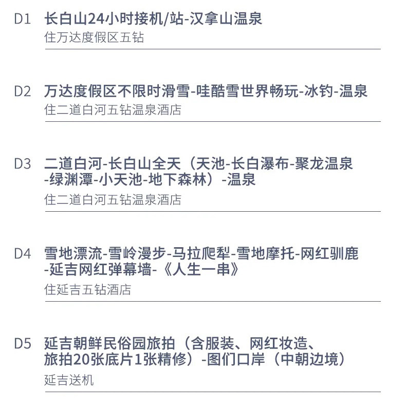 行程横跨延吉、图们等朝鲜族聚居区,通过民俗园探访、特色烤串晚餐等环节,让差旅者高效感知边境文化魅力。在短暂假期中,既能领略长白山自然奇观,又能体验异域人文风情,打破传统差旅的单调性。这种‘自然+文化’双线并行的设计,满足高端商务客群对精神层面的度假诉求,使差旅成为拓宽视野的增值旅程。
